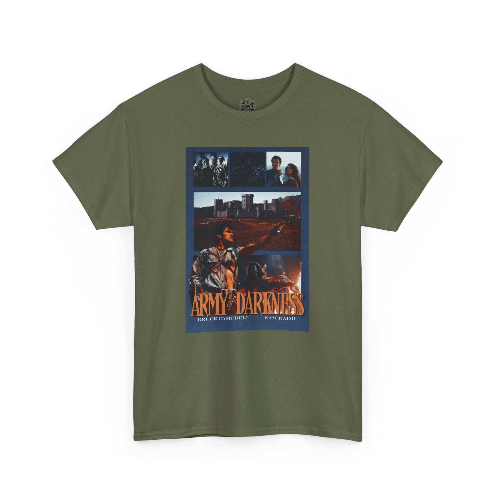 Evil Dead montage tshirt, tshirt is military green in colour. Graphic shows scenes from The Army of Darkness. Perfect for any Ash and Evil Dead fan