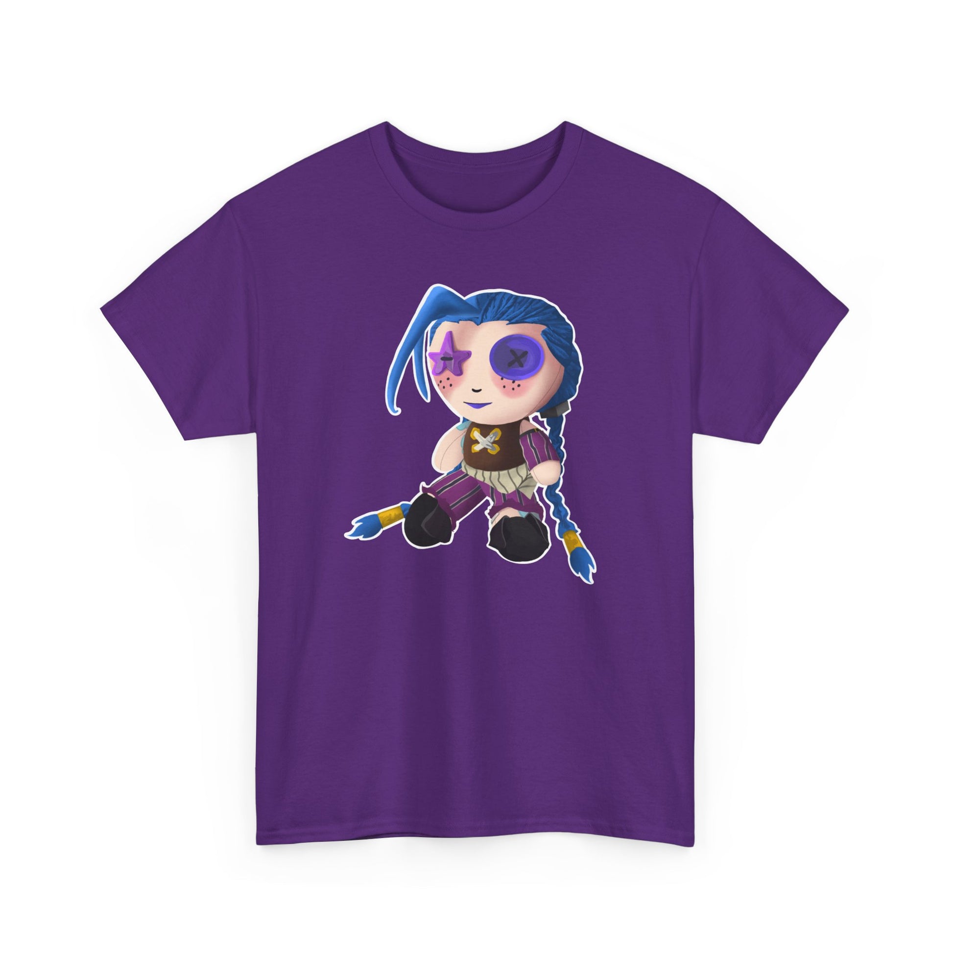A purple anime-themed T-shirt featuring a fan made doll version of Jinx from Arcane. Perfect for anime lovers. Ideal for casual wear or as a statement piece for comic con.
