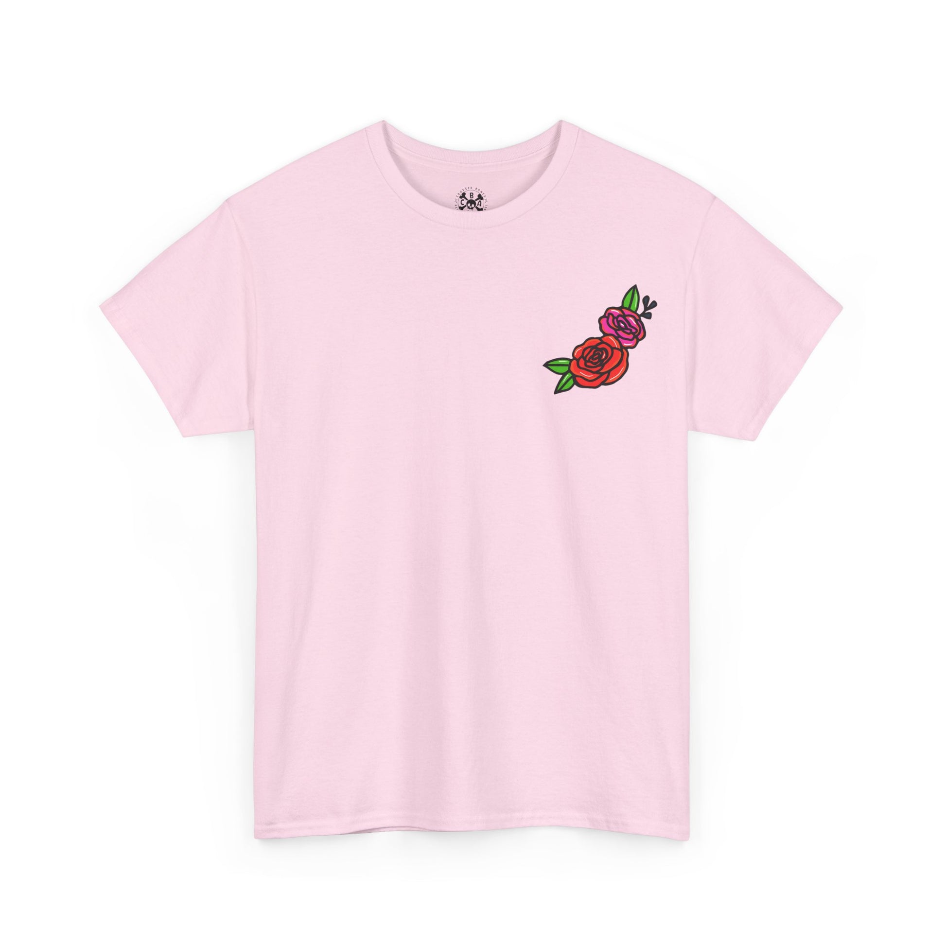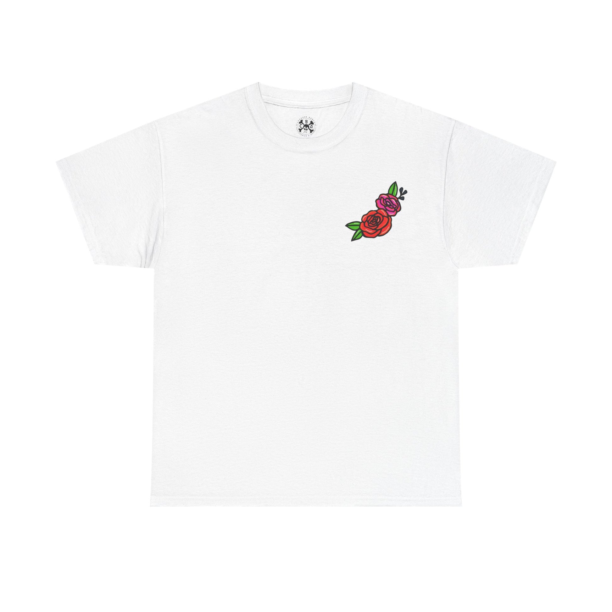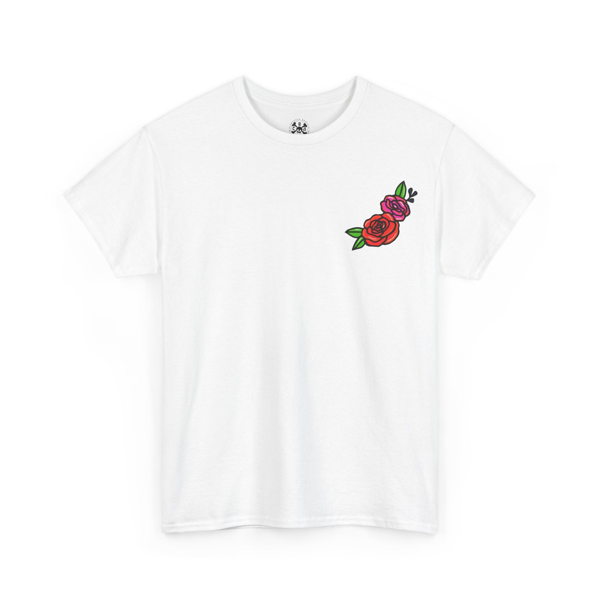A cute and edgy t-shirt featuring a tattoo skull and floral design. This versatile piece can be styled casually or dressed up for a fun and unique look. Perfect for those who love alternative fashion and want to make a statement. Ideal for Halloween, Day of the Dead celebrations, and music festivals.